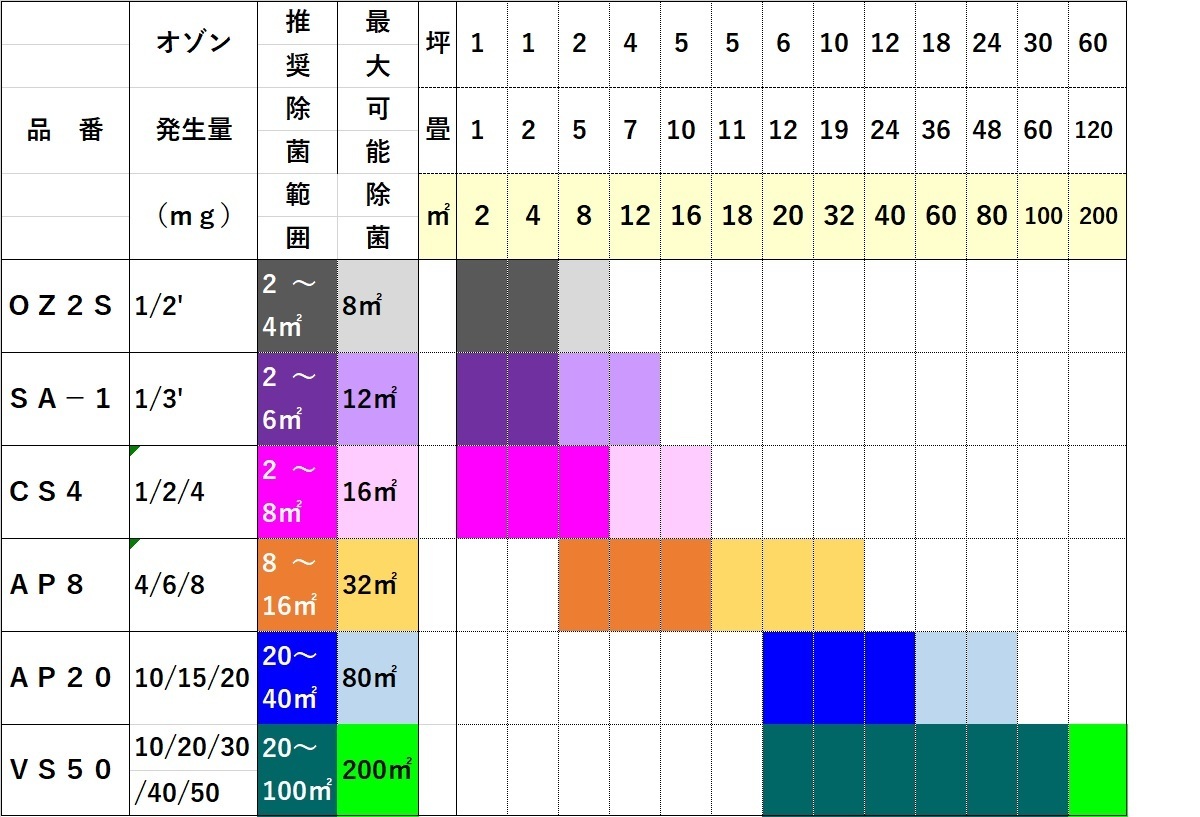 ★ 簡単な業務用のガイドとしては、オゾン発生量1㎎について、1.2畳(㎡)が推奨除菌の広さと、お考え下さい。